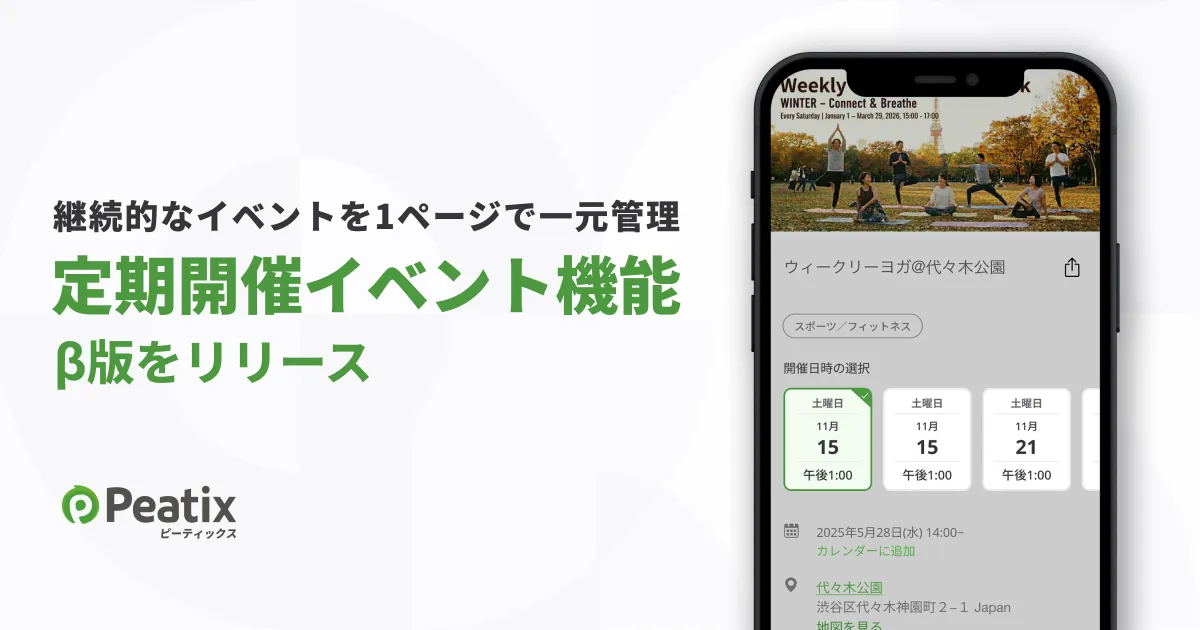 ピーティックスが、定期開催イベント機能のβ版をリリースしました。この新機能は、レッスンや説明会、体験イベントなど、同じコンテンツを繰り返し開催する場合の告知と運営を一元的に行えるものです。これまでイベント主催者は、個々の日時に応じて告知ページを分けるか、1つのページ内でチケットによって日時を区別する必要があり、管理が複雑でしたが、今回のアップデートにより、すべてを1つのページで管理できるようになりました。