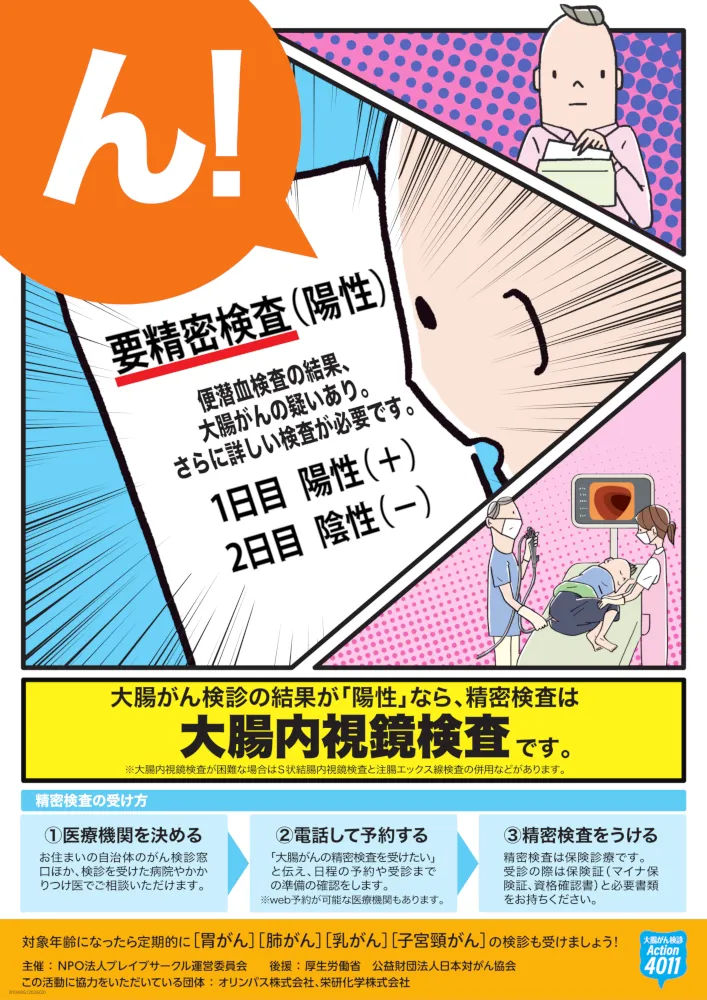 特に精密検査用のポスターは、便潜血検査で陽性結果が出た後の受診者を対象にデザインされたもので、精密検査を受ける重要性を強調しています。多くの人が「大腸がんは自分には関係ない」と思いがちですが、進行した後では手遅れとなる場合も珍しくありません。