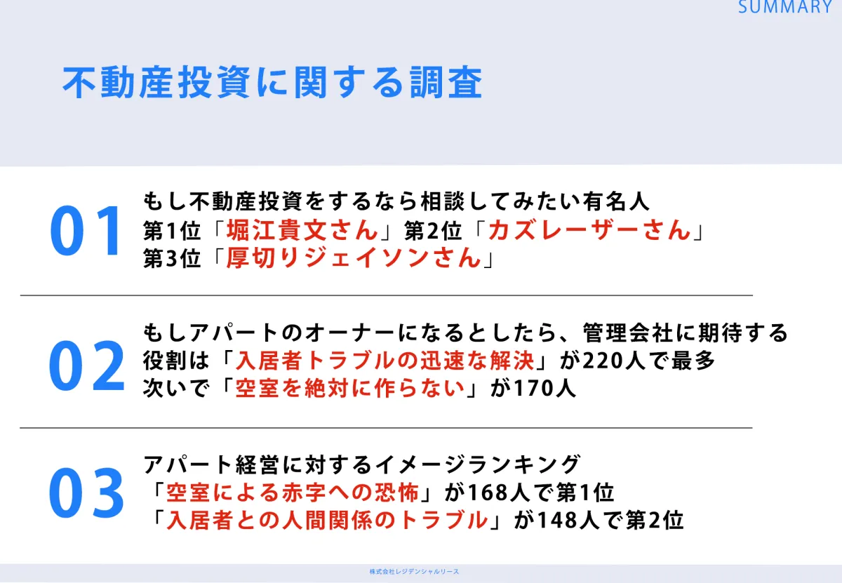 調査の結果、40歳以上の会社員304名の中で、不動産投資について相談したい有名人の第1位に「堀江貴文さん」が選ばれたことから、彼の経歴や理論的な思考が多くの人々から信頼されていることが浮き彫りになりました。また、アパート経営の管理会社に期待される役割や経営に対するイメージも興味深い結果であり、今後の不動産投資がますます注目される要因になるでしょう。