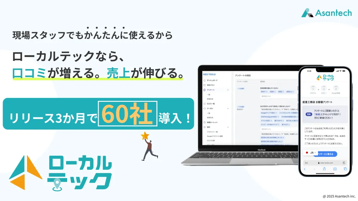 2025年7月にリリースされた「ローカルテック」は、口コミ獲得とMEO(Googleビジネスプロフィール最適化)内製化を実現するためのツールです。近年、口コミを集めることの重要性が増す中で、多くの企業から高い評価を受けており、リリースからたった3か月で導入社数が60社を突破しました。