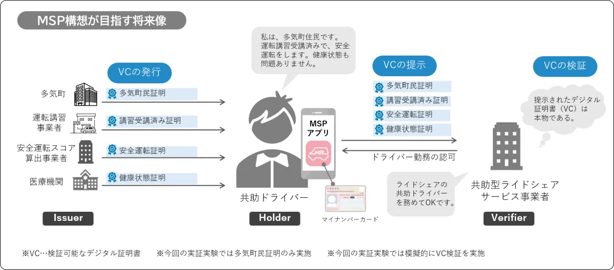 今回の実証実験は、地域住民同士が助け合うライドシェアが、移動の不便さを解消する手段となるのかを検証することが目的です。特に自工会が提唱するMSP構想(Mobility Smart Passport)に基づいた取り組みとして、技術的な側面からも実証されました。