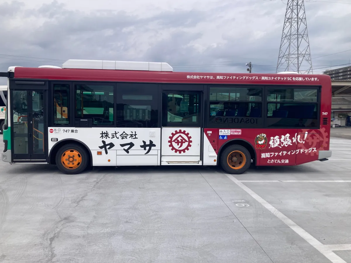 ラッピングバスは、ヤマサのコーポレートカラーであるえんじ色を基本色に、高知県のスポーツチームである「高知ファイティングドッグス」及び「高知ユナイテッドSC」のロゴマークが大きく描かれています。このデザインセンスは、地域に根付くスポーツ文化を応援するというヤマサの強いメッセージを込めているのです。