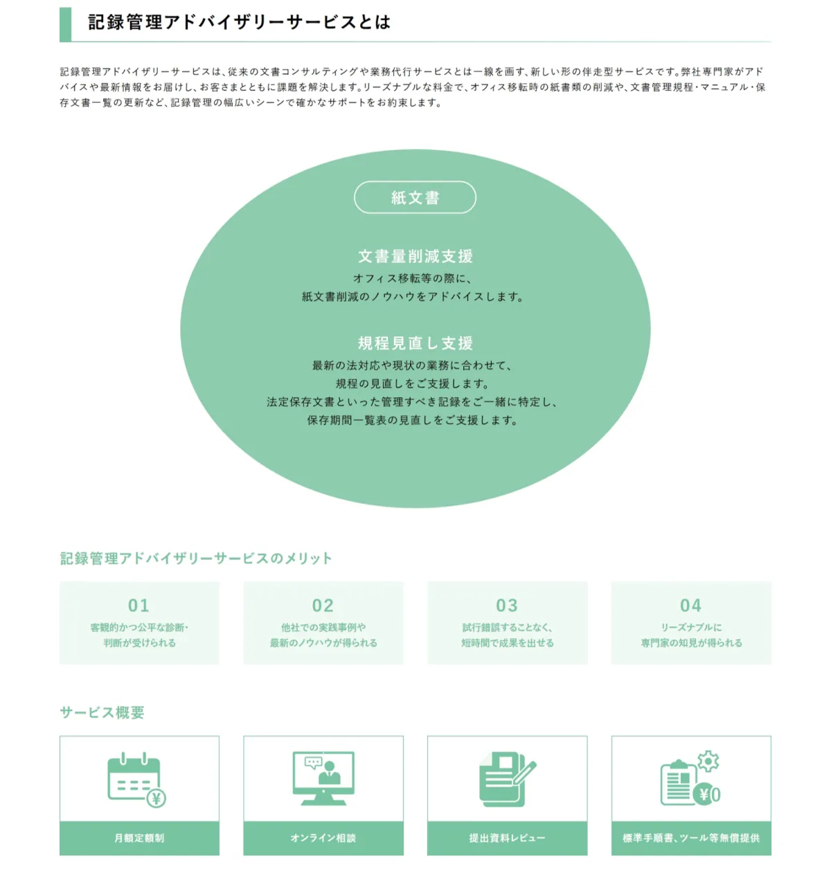 NIPPON EXPRESSホールディングス傘下の株式会社NXワンビシアーカイブズは、2023年11月から新たに月額制のアドバイザリーサービスを提供開始しました。これにより、従来の高額な文書管理コンサルティングサービスとは一線を画し、より多くのお客様に質の高いサポートを手軽な価格で提供していくという新たな方針が打ち出されました。