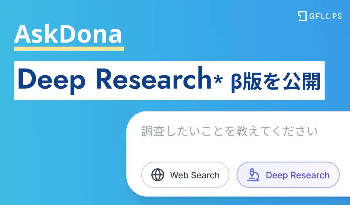 株式会社GFLOPS(ジーフロップス)は、東京・渋谷を本社とし、法人向け生成AIプラットフォーム「AskDona」に新たに「Deep Research」機能のβ版を追加しました。この新機能は、製造業や研究機関を中心に導入が進む中、日常業務の効率化を目的としています。従来の「ウェブ検索」機能を用いることで、短時間で最新情報を収集し回答を生成することは可能でしたが、特に難しい「調査タスク」に対応するため、より高い専門性を求められる場面でも活躍するのが「Deep Research」です。