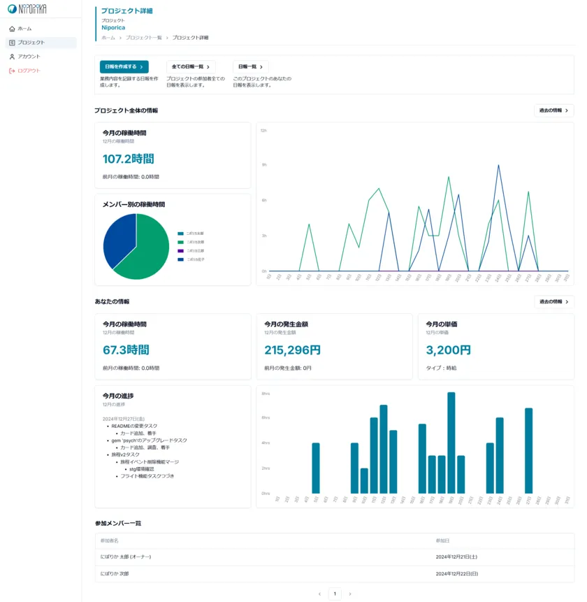 「Niporica」では、プロジェクトごとの稼働時間を自動的に集計し、見やすいダッシュボード形式で確認できるため、管理者もメンバーも直感的に状況を把握できます。また、チームメンバーを招待することで、全体の進捗や稼働時間を一元的に管理できる点が特長です。