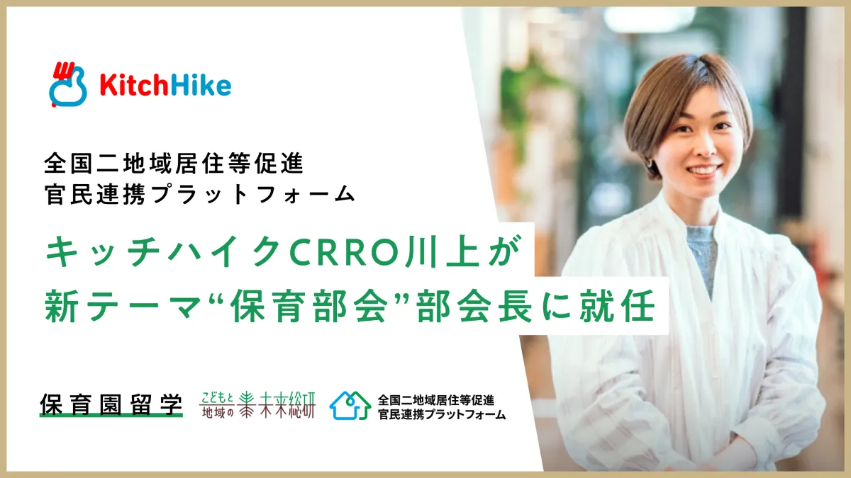 2024年10月29日、全国二地域居住等促進官民連携プラットフォームにおいて新設された「保育部会」に、株式会社キッチハイクの川上真生子が部会長として就任しました。この新しい部会は、地域の保育環境を強化し、子育て家族の二地域居住を促進することを目指しています。