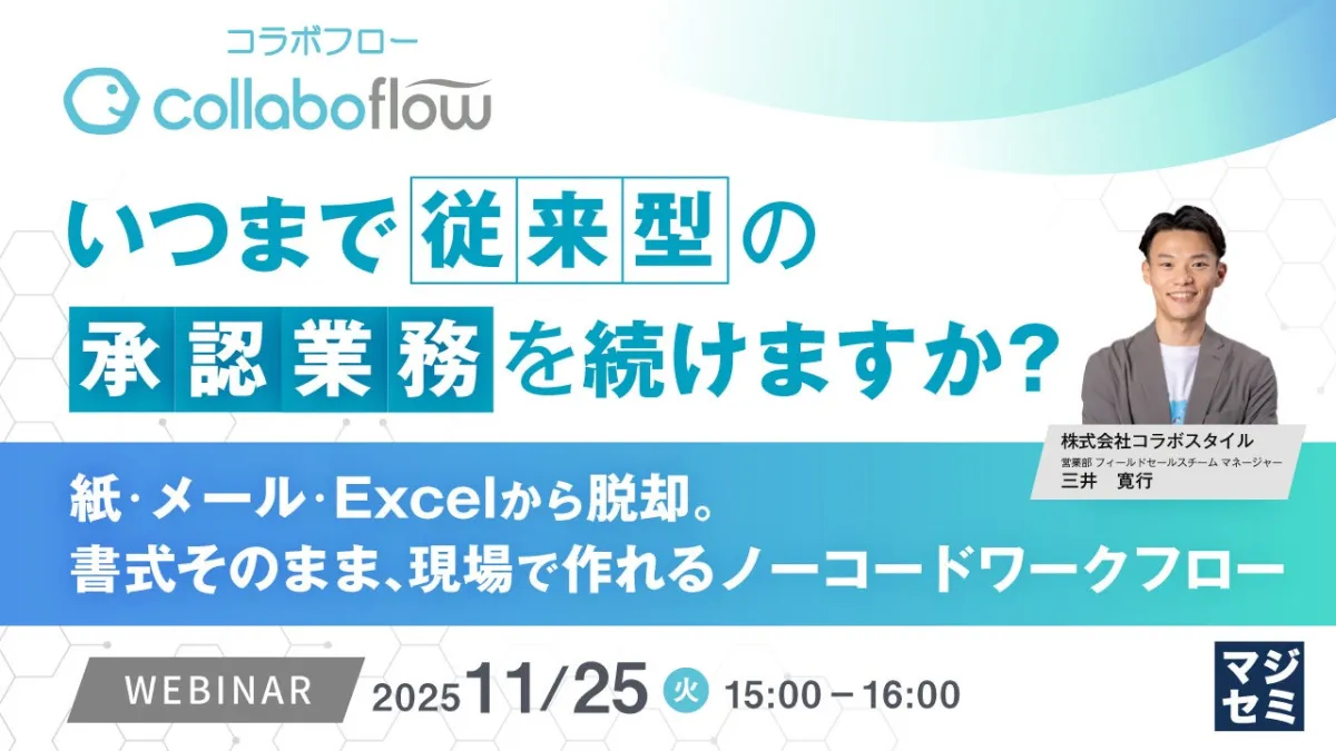 企業が抱える業務プロセスの課題は年々増加しています。「書類処理のために出社している」「同じデータを何度も入力している」といった悩みは、多くの職場で共通の痛みです。そんな中、「いつまで従来型の承認業務を続けますか?」というテーマのウェビナーが開催されます。このウェビナーでは、現場主導での業務の生産性向上に向けた新しいアプローチを紹介します。
