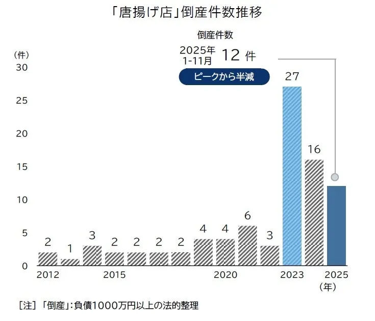 2025年の初めから11月までに発生した唐揚げ専門店の倒産件数は12件で、これは過去の最多件数である2023年の27件から大幅に減少した結果です。前年の16件に対しても25%の減少を記録しており、この数値は唐揚げ専門店が現在の厳しい経済環境でも生き残るための努力をしていることを示しています。