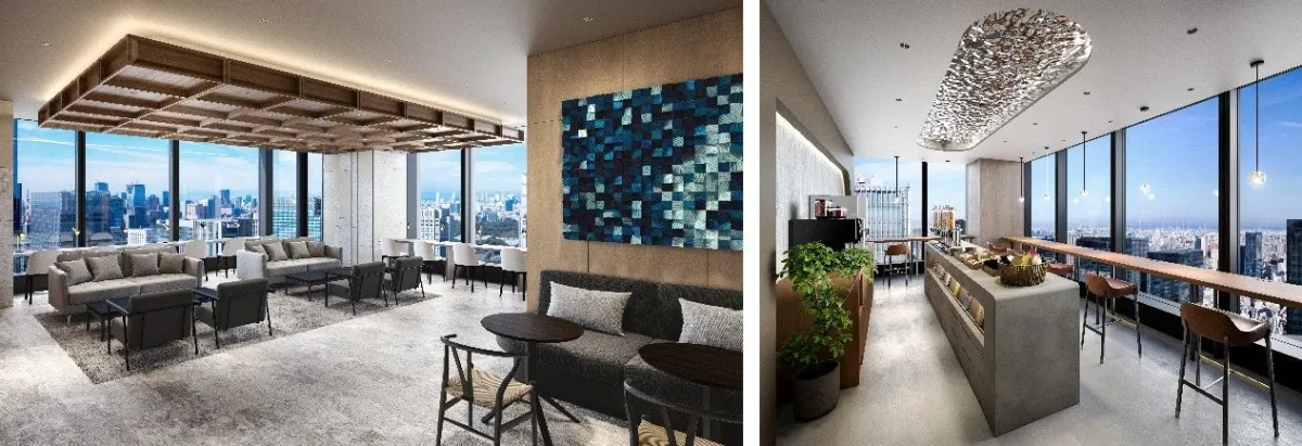 41階には、町屋をテーマにデザインされた豪華な共用ラウンジや、会員専用のClub Loungeが設置されています。ここでは、ドリンクや軽食を楽しみながらリフレッシュできる特別なひとときを提供されます。また、茶室をイメージしたミーティングルームや1名用のWEB会議ブースなども完備。用途に応じた多様なスペースが設計されており、それぞれのニーズに対応しています。