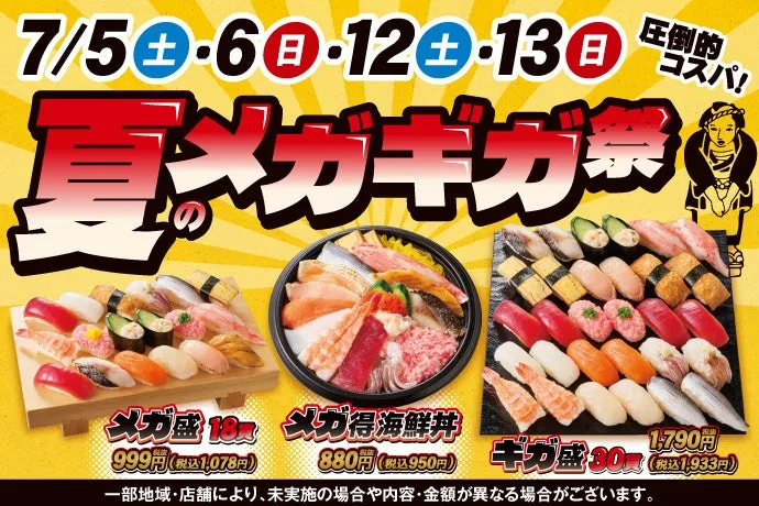 ボリューム満点でリーズナブルなお寿司が楽しめる『夏のメガギガ祭』は、食欲の夏にぴったり。家族や友達と共に、おいしいお寿司で素敵なひとときを過ごしましょう!