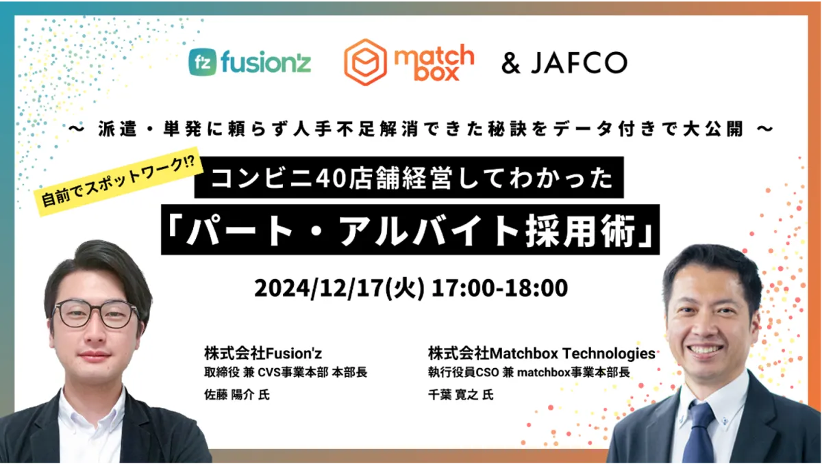 2024年12月17日、業界の注目の無料ウェビナーが開催されます。タイトルは「自前でスポットワーク!?コンビニ40店舗経営してわかった『パート・アルバイト採用術』」。コンビニ業界において、40店舗以上の経営を成功させた株式会社Fusion'zが講師となり、各店舗が直面している人手不足問題を解決するための新しい採用手法「セルフソーシング」について詳しく解説します。