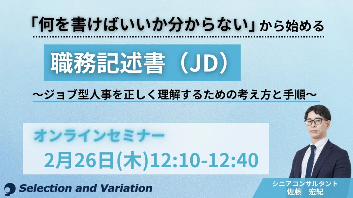 株式会社セレクションアンドバリエーションは、2026年2月26日(木)12:10から12:40まで、職務記述書(JD)に関するオンラインセミナーを開催します。本セミナーは、職務記述書の作成に対する悩みを解消し、ジョブ型人事制度の理解を深めるためのものです。