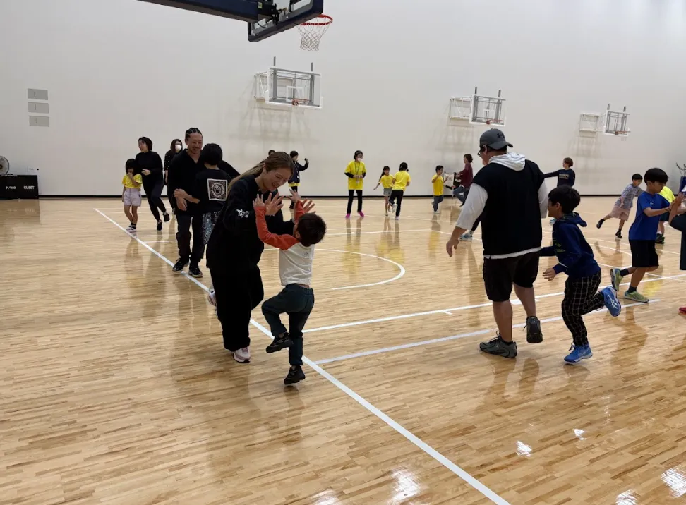 この日のプログラムは、まずウォーミングアップから始まり、ボールを使った動きやシュート体験、さらにはミニゲームを通じて親子やグループでの協力を体感しました。特に、未就学児が親と共に運動する場面は非常に和やかで、緊張感が和らいだ雰囲気が漂っていました。