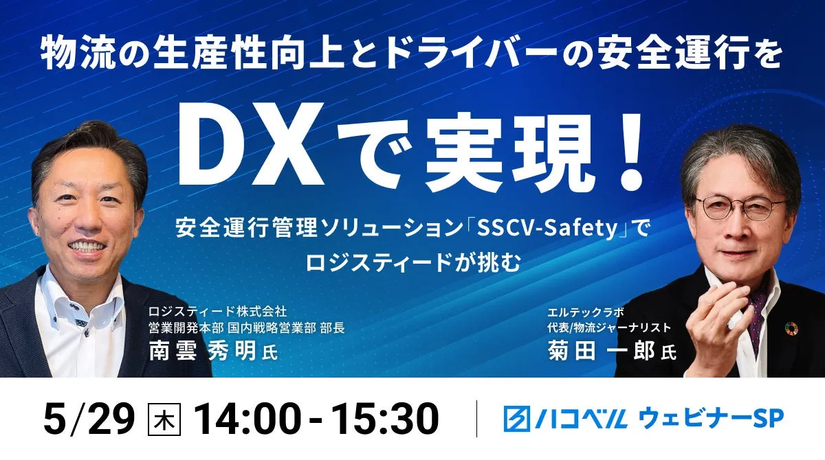 2025年5月29日、ハコベル株式会社が主催するウェビナーが開催される。このウェビナーでは、業界のリーダーとして知られるロジスティード株式会社の南雲秀明氏がゲスト登壇し、物流の生産性向上とドライバーの安全運行をDX(デジタル・トランスフォーメーション)で実現するための取り組みを詳しくお話しする予定である。