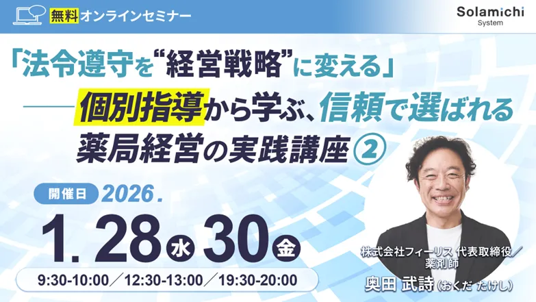 株式会社ソラミチシステムは、1月28日と30日に「法令遵守を“経営戦略”に変える」と題した無料オンラインセミナーを実施します。これは薬局経営における信頼構築の重要性を考える貴重な機会です。講師には株式会社フィーリスの代表取締役、奥田武詩氏を迎え、全6回シリーズで展開されるこのセミナーは、昨年11月と12月の第1回で75名以上が参加し、高い満足度を記録しました。