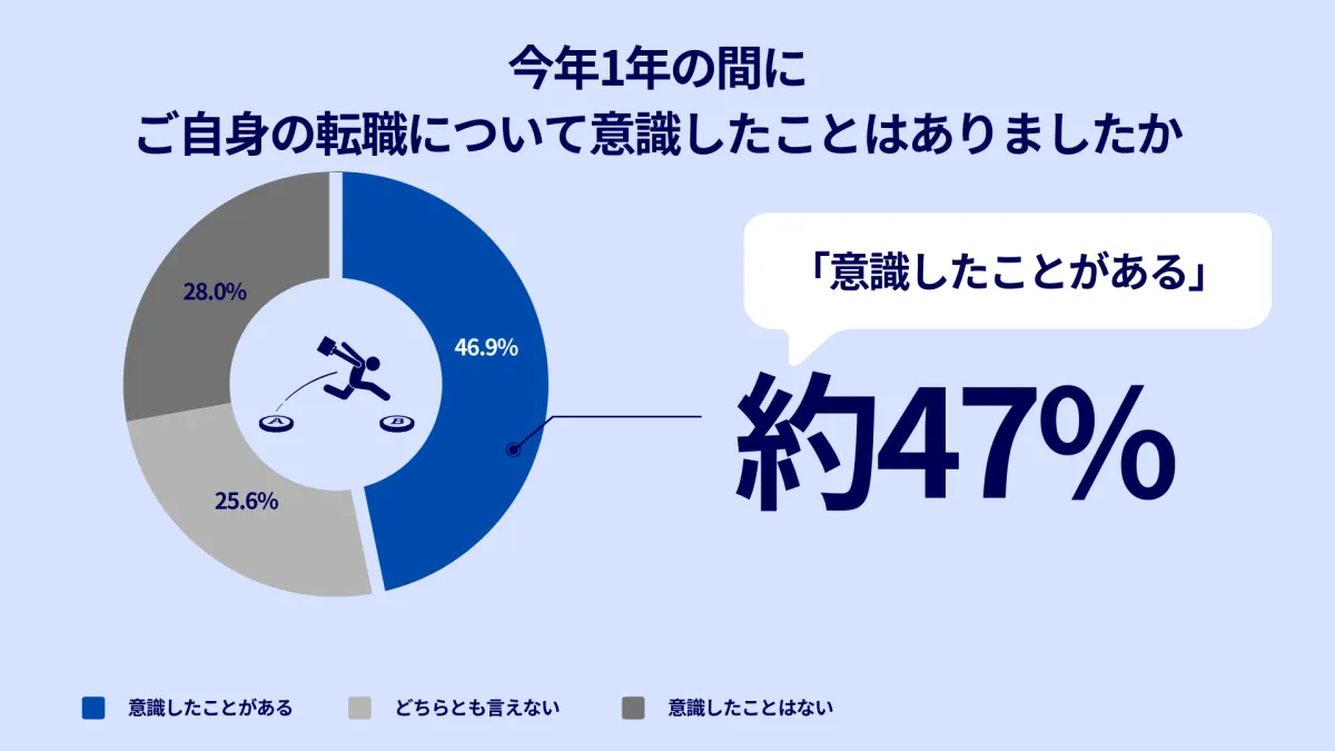 調査の結果、約46.9%の人が今年一年で自身の転職を意識していることがわかりました。このデータは、現在の職場での安定性に対する不安が高まっていることを示唆しています。特に「どちらとも言えない」と答えた人を含めると、職を安易に選ぶことが少なく、多くのビジネスパーソンが常に次のキャリアを意識しながら日々の業務にあたっています。