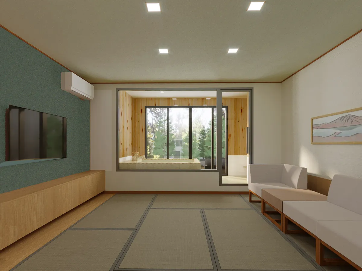 新しくリニューアルされる客室は、洗練された和のデザインが特徴です。大きな窓からは周囲の美しい自然を眺望でき、心が落ち着く空間が広がっています。半露天風呂付きの和室では、ゆったりとした湯浴みを楽しむことができ、風情あるタイル張りの湯舟で、心地よい温もりに包まれながらのひとときが味わえます。さらに、くつろぎを意識したソファも設置され、長時間の滞在でも快適に過ごせる配慮がなされています。