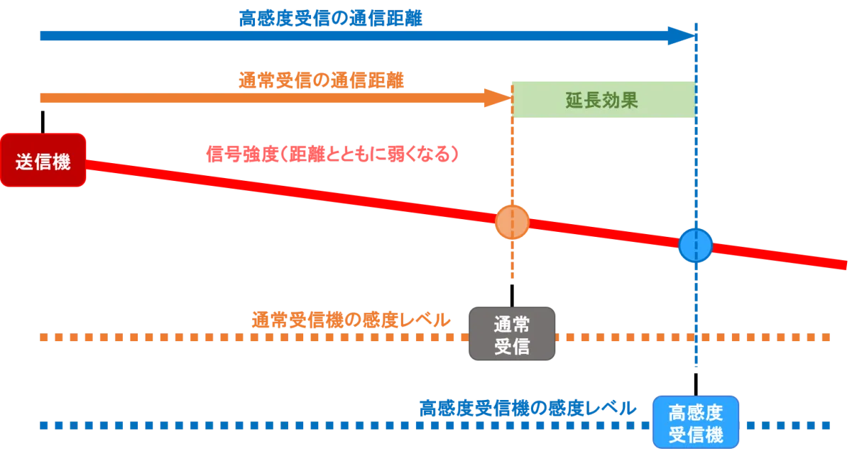 新しい製品の特徴は、受信感度の大幅な向上です。これにより、実際の通信 性能は500mW相当となり、従来困難であった長距離通信が実現可能に。送信出力は同じでも、新たに追加された高感度受信技術により、微弱な信号もしっかり受信できるため、通信距離が延び、より広範囲でのデータ通信を可能にします。