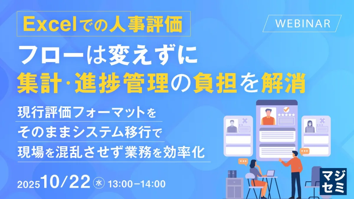 多くの企業が人事評価制度をExcelで管理している現状があります。長年にわたり使用してきたこの方法は、組織ごとに独自の評価基準や算定方法が組み込まれており、社員にとっても馴染みのあるシステムです。しかしながら、評価対象者が増加するにつれ、集計や進捗管理の複雑さが増しているため、担当者には大きな負担がかかっています。この状況を改善するため、特別なウェビナーを開催します。