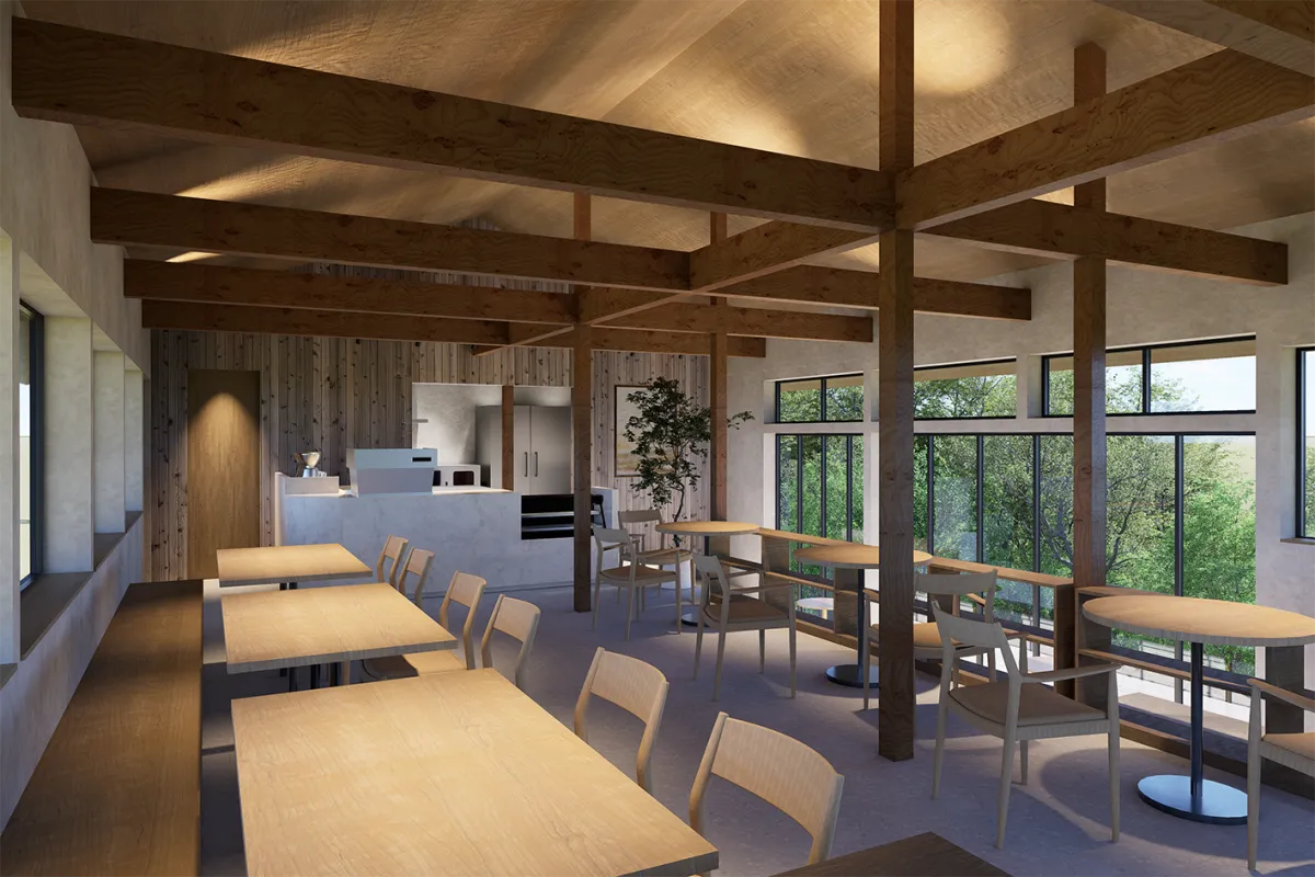 「HARUKA Coffee & Table」は、地域の人々や観光客が集まる開放的な場所として設計されています。移転先の建物は元々「東屋」として利用され、宿泊客や地元住民がふらっと立ち寄れる自由な空間が魅力です。このカフェでは、北海道産の木材を贅沢に使用した温かみのあるインテリアが特徴で、訪れる人々が自然を感じられるような設計が施されています。自然と調和した環境の中で、ゆったりとした時間を過ごすことができるでしょう。