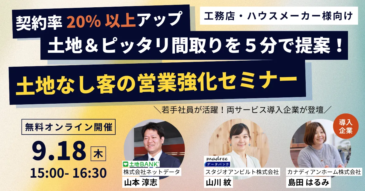 今、工務店やハウスメーカーが直面している課題の一つが、土地なしのお客様への対応です。岡山県に本社を置く株式会社ネットデータが提供する「土地バンク」と、名古屋市の株式会社スタジオアンビルトが運営する「madreeデータバンク」は、合同でオンラインセミナーを開催し、参加者に向けて契約率を20%向上させる方法を提案します。