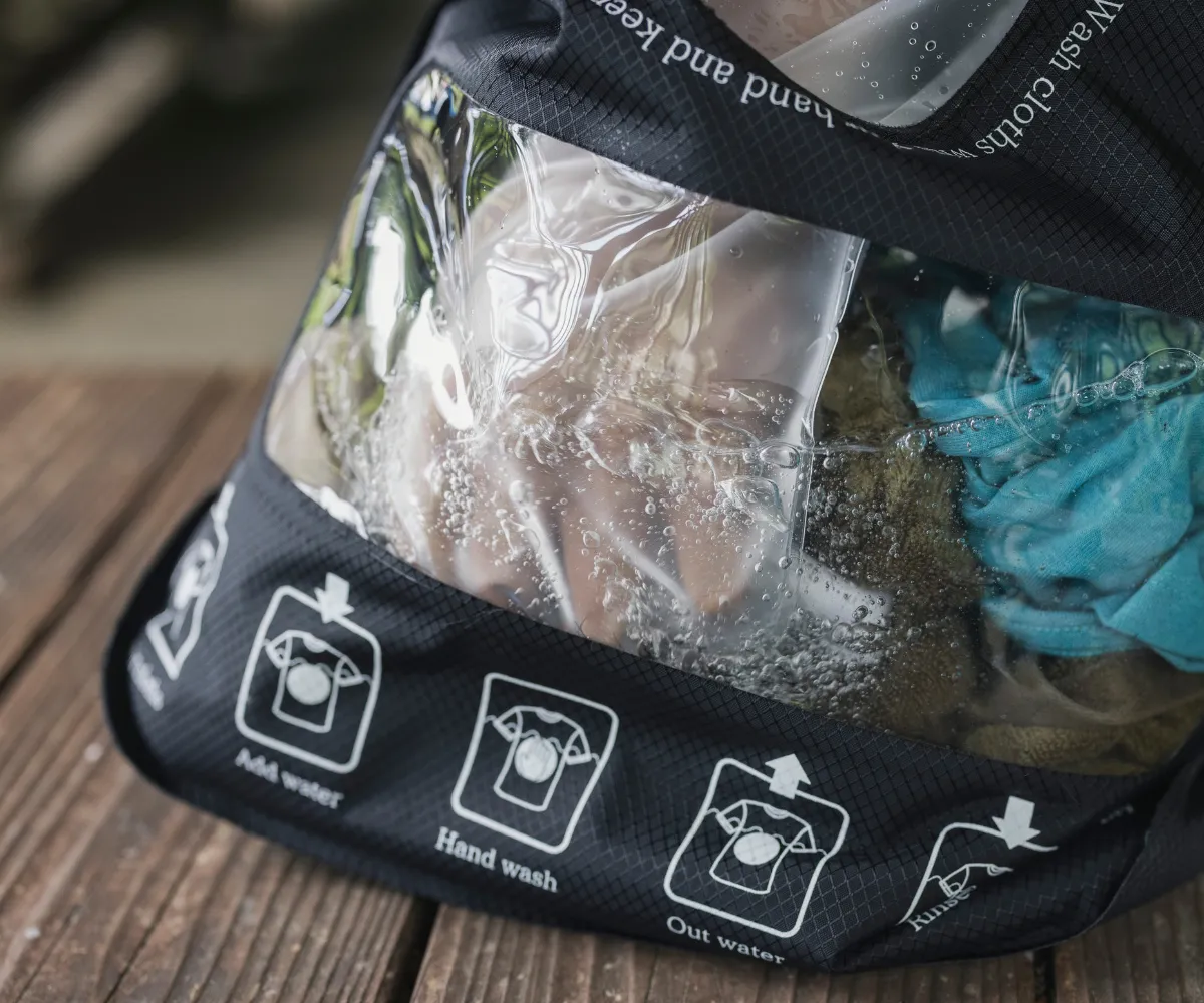 「Hand WashBag」は、手袋一体型の設計が特徴です。外側には滑り止め効果のある丈夫な素材を使っており、手を入れることで簡単に揉み洗いができます。寒い水や環境でも扱いやすく、旅行先でもストレスなく使用できます。