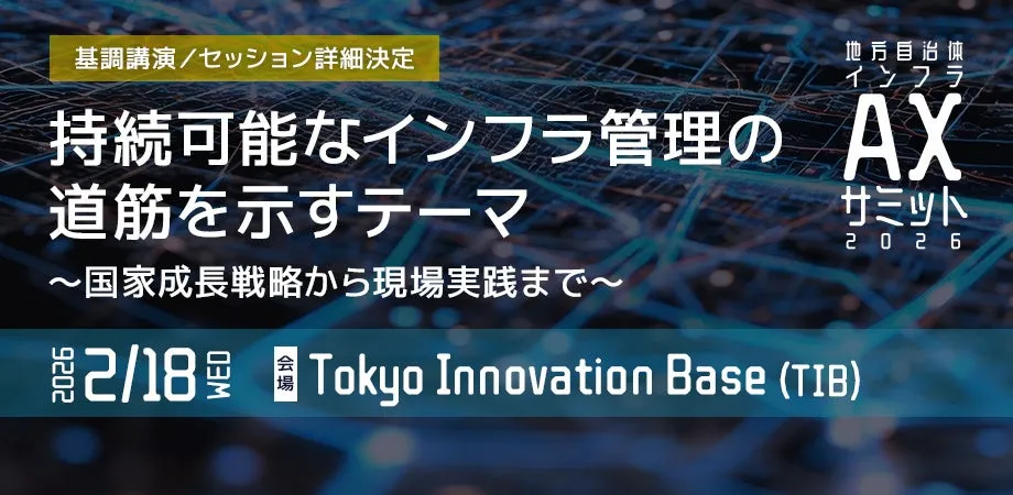 2026年2月18日(水)、東京イノベーションベースにて「地方自治体インフラAXサミット2026」が開催されます。本辺りのサミットは、限られたリソースの中で持続可能なインフラ管理に向けた新たな視点を提供することを目的としており、中央省庁や大学教授が登壇する3つの基調講演と全国の先進自治体や企業による各種セッションが実施されます。