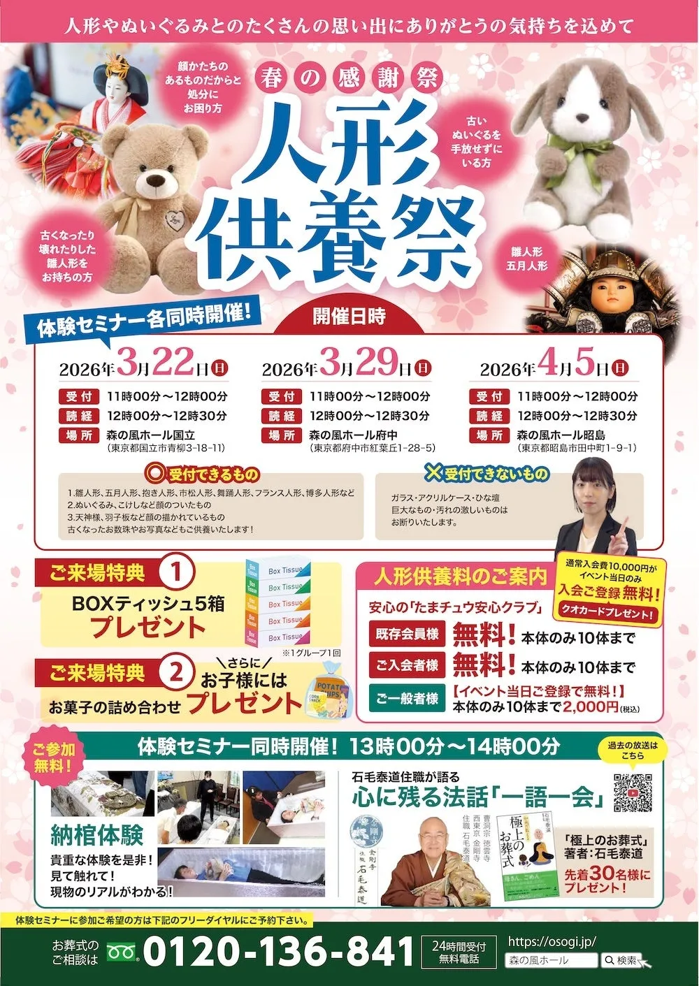 このような声に何年も応えてきたのが、東京都立川市に本社を構える株式会社多摩中央葬祭です。2026年3月22日から4月5日にかけて、同社は「春の感謝祭 人形供養祭」を、国立市、府中市、昭島市の「森の風ホール」3会場で開催します。このイベントは毎年多くの地域住民に支持されており、人形やぬいぐるみなどを丁寧に供養する場として注目を集めています。