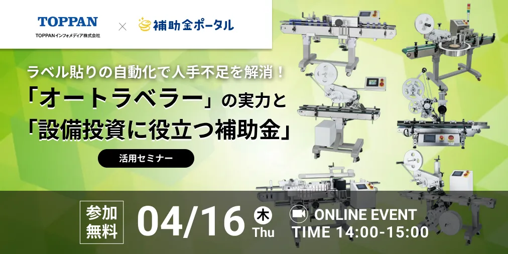 現代の製造業、物流、食品加工業界では、慢性的な人手不足が深刻な問題となっています。特に、製品へのラベル貼り作業は依然として手作業で行われることが多く、効率的な作業が望まれています。この課題に対し、株式会社補助金ポータルがTOPPANインフォメディアと共催するオンラインセミナー「ラベル貼りの自動化で人手不足を解消!『オートラベラー』の実力と『設備投資に役立つ補助金』活用セミナー」が注目されています。