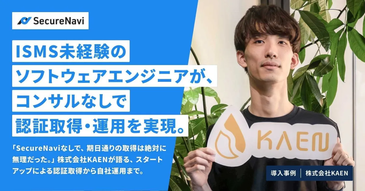 2023年9月、KAENはISMS認証を取得するために「SecureNavi」を導入しました。このツールは、ISMSやPマークに関する取り組みを効率化し、認証取得のコストや工数を削減するためのものです。