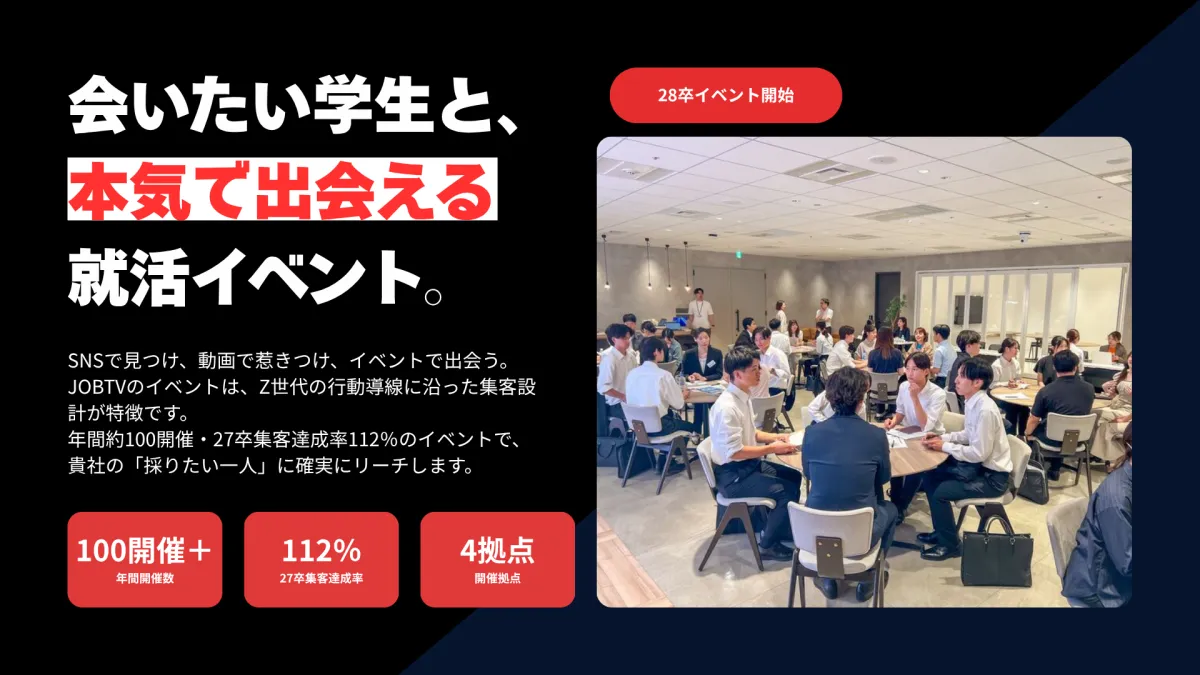 今後の採用市場は、「集める」ことから「関係を設計する」方向へ進むと考えられています。JOBTVは、SNS、動画、対面を融合させた新しいプラットフォームとして、28卒向けに年間100回のイベントを開催し、企業と優秀な学生との接点を恒常的に作り出すことを目指します。これにより、採用活動を通じて企業ブランディングも促進していく予定です。
