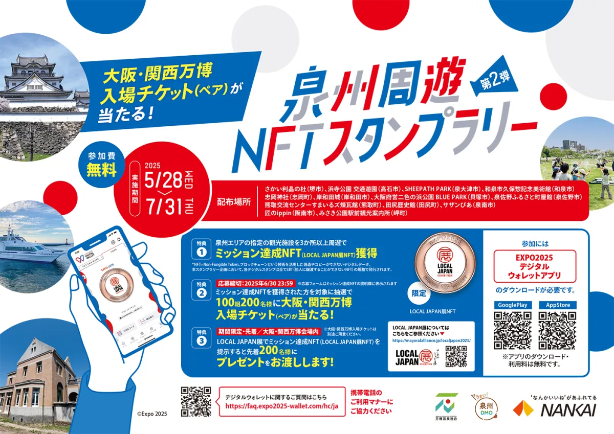 株式会社HashPortと南海電気鉄道が共催する「第2弾 泉州周遊NFTスタンプラリー」が、2025年5月28日から7月31日までの期間開催されます。これは、前回の「なんば周遊NFTスタンプラリー」に続くもので、NFTやブロックチェーン技術を活用して新たな観光体験を提供し、2025年大阪・関西万博への関心を高めることを目的としています。