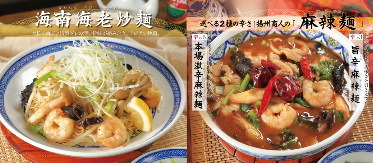 中国ラーメン揚州商人から、2025年9月16日より期間限定の秋メニューが登場します。新商品の「海南海老炒麺」と「麻辣麺」をご紹介しましょう。