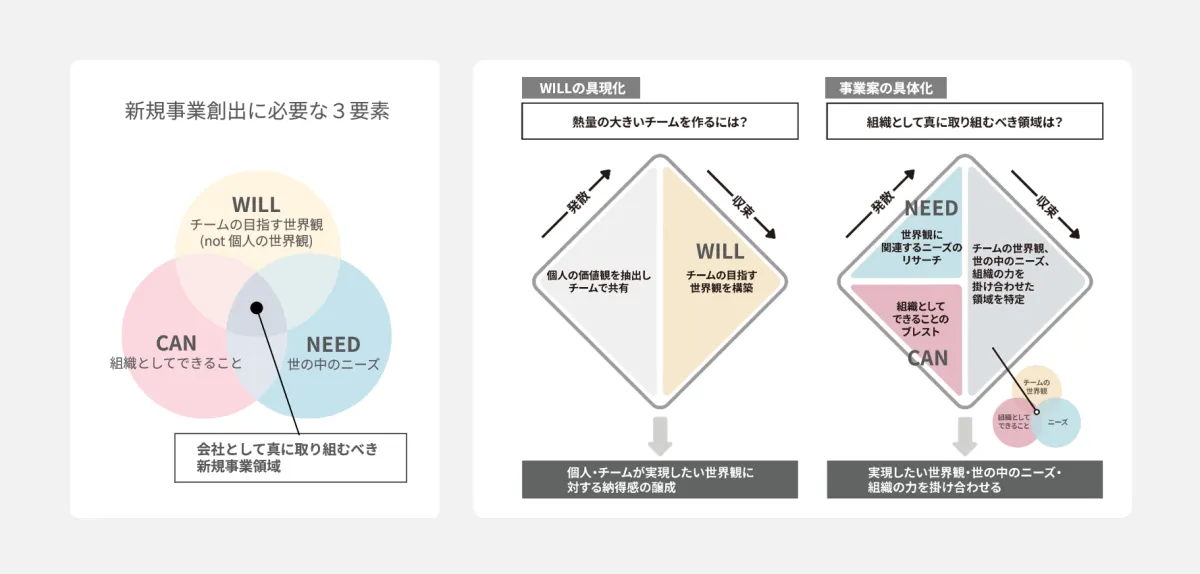社員一人ひとりが主体的に参加し、自分の内発的な動機を基に新規事業のアイデアを考えます。この際、「WILL(やりたいこと)」「CAN(できること)」「NEED(社会に求められること)」の3つの視点からのワーク設計が行われます。このプロセスでは、参加者が自由に発言し、新たなビジョンを共有することが重要です。