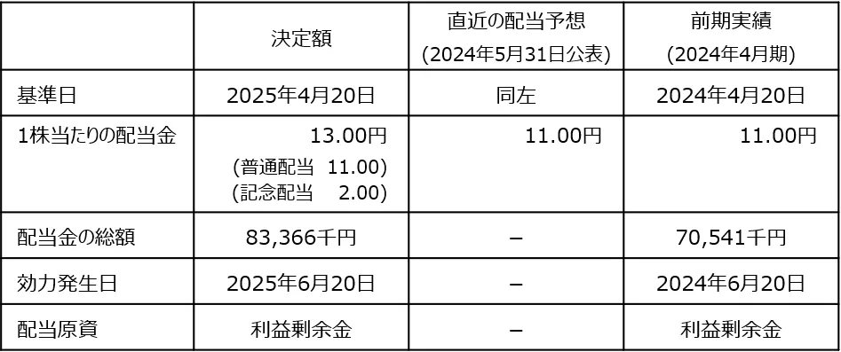 2025年4月期の決算において、ダイサンは1株当たり2円の記念配当を支給することに決定しました。これにより、同期の期末配当金は通常の11円に加え、記念配当の2円を加えた合計13円となります。この特別配当は、株主の支援に対する感謝の気持ちをより具体的に示すものです。