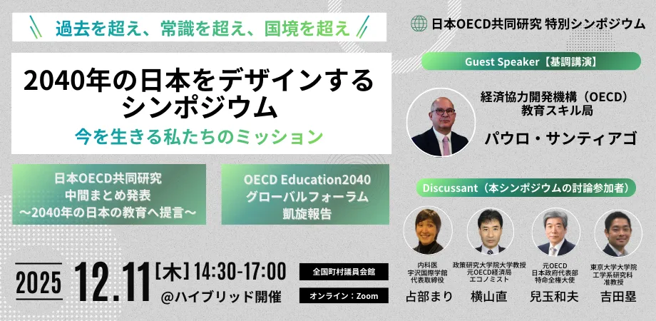 このたび、日本OECD共同研究の一環として、「過去を超え、常識を超え、国境を超え──2040年の日本を教育からデザインするシンポジウム」が開催されます。このイベントでは、OECD教育スキル局のパウロ・サンティアゴ氏を基調講演者として招き、2040年における日本の教育と社会の未来について様々な視点から考察します。