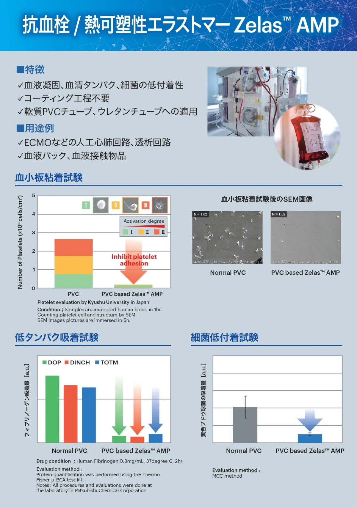 「Zelas™ AMP」は、親水性と疎水性を兼ね備えた両親媒性ポリマーです。このポリマーは、医療機器の基材となる樹脂(例えば、塩化ビニルやウレタン)に添加することにより、抗血栓性や低タンパク質吸着性、低細菌付着性を実現します。これにより、医療機器のリスクを低減し、製造コストの削減が期待されます。