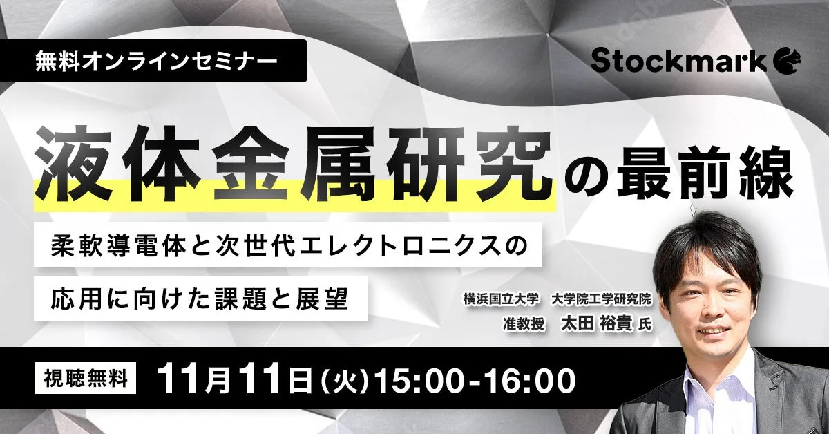ストックマーク株式会社は、11月11日(火)にオンラインセミナー『液体金属研究の最前線 ― 柔軟導電体と次世代エレクトロニクスの応用に向けた課題と展望』を開催します。このセミナーでは、液体金属の研究やその応用について深く掘り下げます。