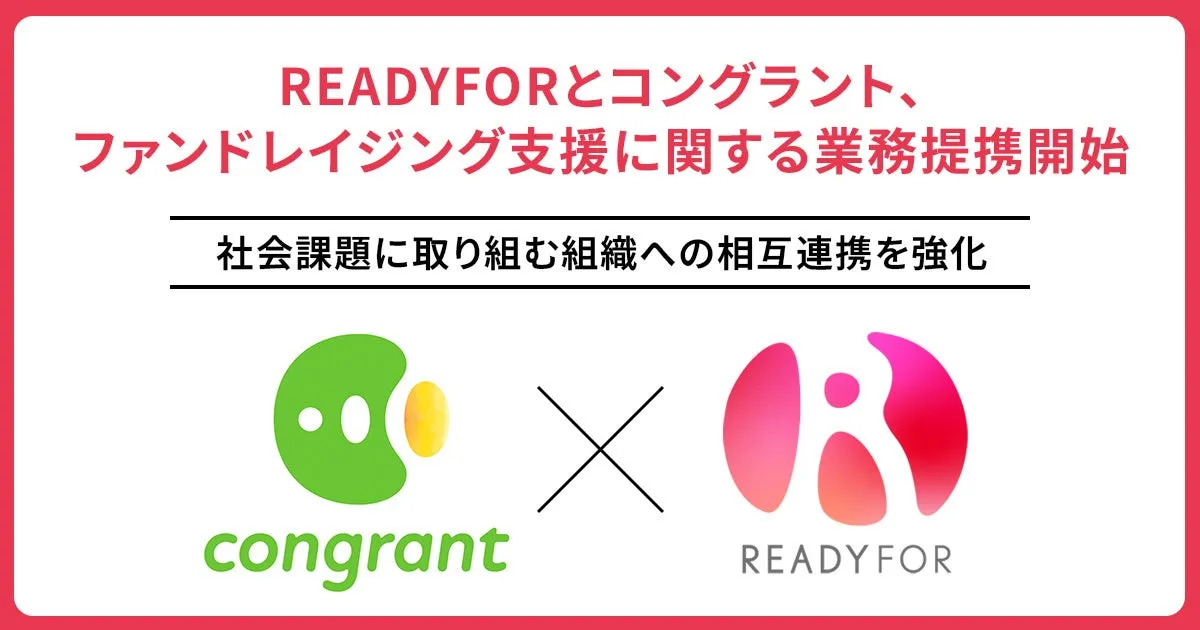 日本国内で最も注目されているクラウドファンディングサービスを提供するREADYFOR株式会社(本社:東京都千代田区)と、企業およびソーシャルセクター向けに寄付のデジタルトランスフォーメーションシステムを提供するコングラント株式会社(本社:大阪府)は、ファンドレイジング支援のための業務提携を締結しました。