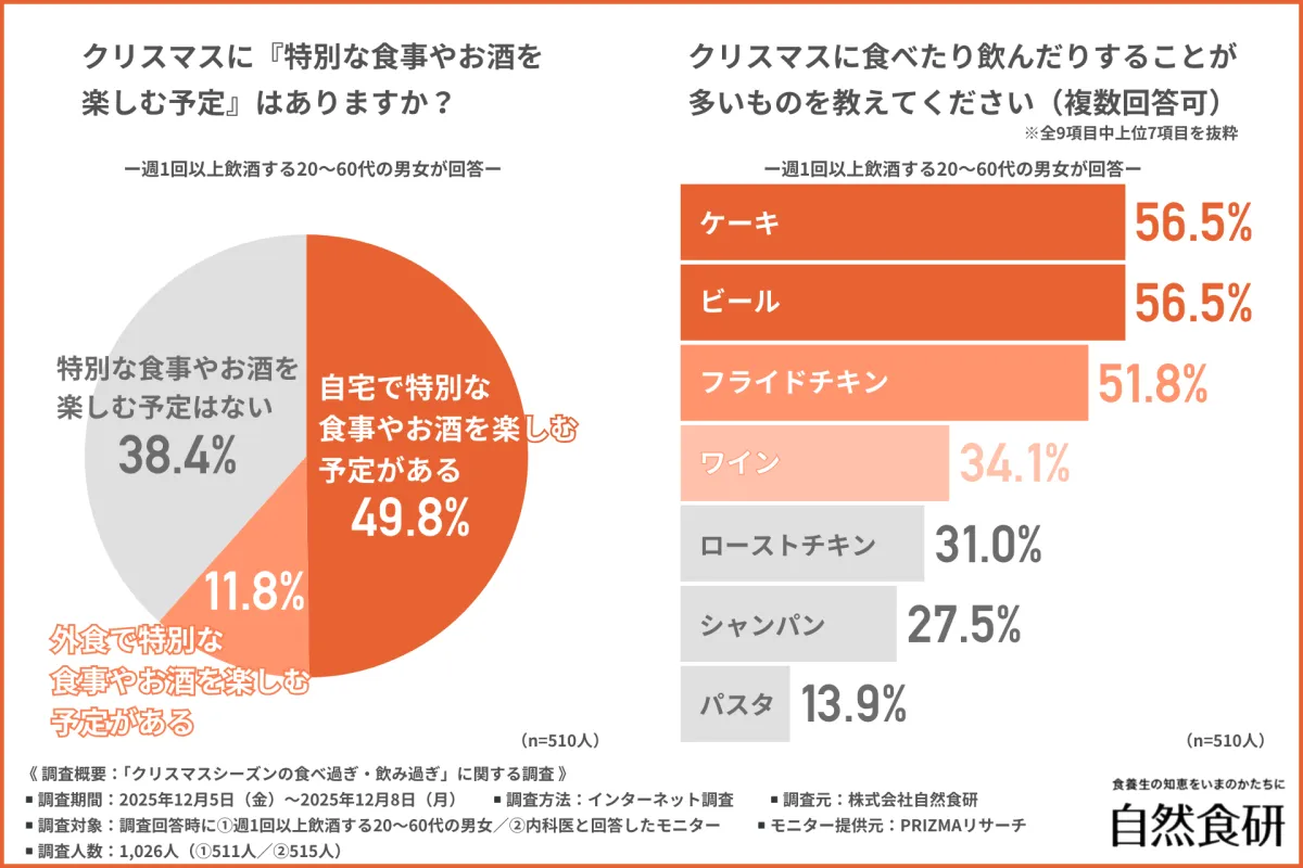 クリスマスが近づくと、特別なメニューを楽しむことが多くなりますよね。特に脂質や糖質、アルコールが揃うこのシーズン、ついつい食べ過ぎてしまう人も少なくありません。今回は、株式会社自然食研が行った「クリスマスシーズンの食べ過ぎ・飲み過ぎ」に関する調査結果を元に、私たちの体にどのような影響があるのかを見ていきたいと思います。
