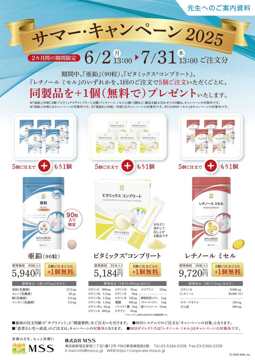 今年の夏、より健康的な生活を目指しませんか?医療機関専用サプリメントを提供する株式会社MSSでは、2025年6月2日から7月31日までの期間限定で「サマー・キャンペーン2025」を開催しています。このキャンペーンでは、特定のサプリメントを購入すると、無料で追加製品が手に入るお得な特典が用意されています。