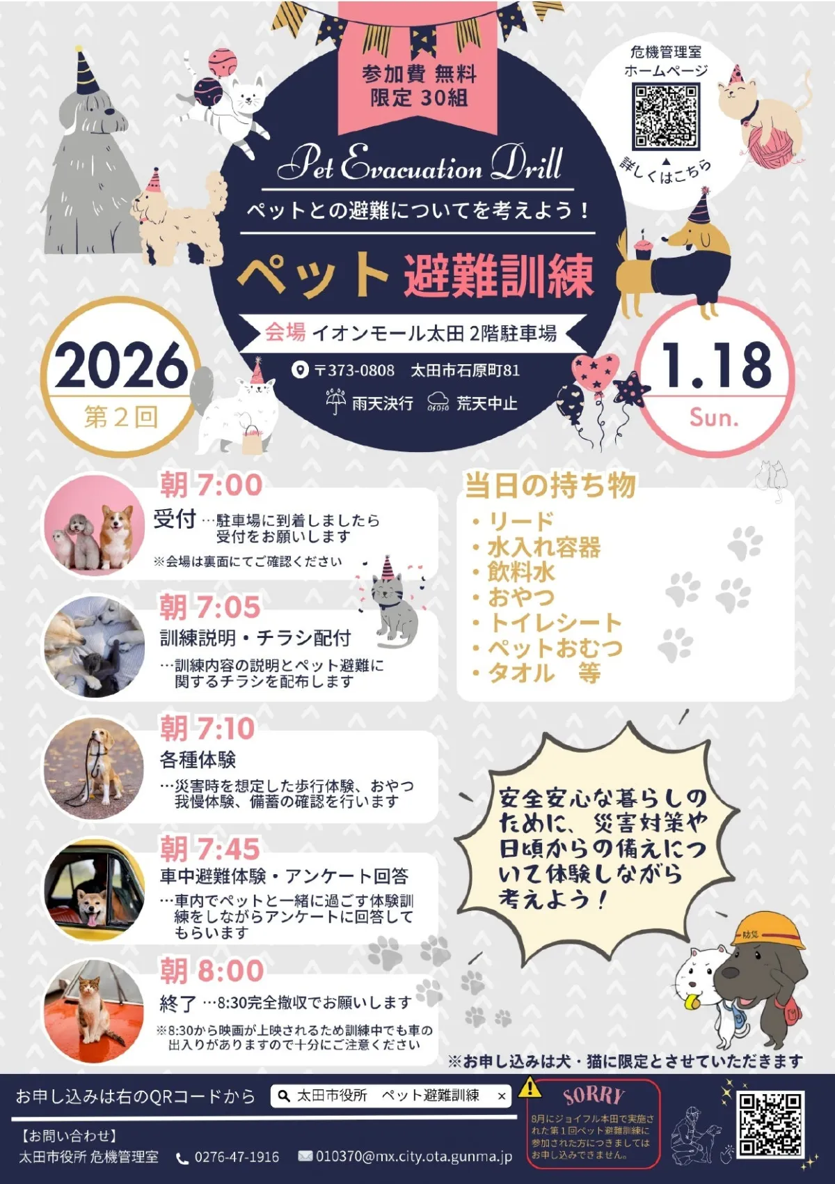 群馬県太田市のイオンモールで、2026年1月18日(日)に「第2回ペット避難訓練」が行われます。このイベントは、災害時に愛するペットを守るための重要な取り組みです。災害を想定した避難訓練を実際に体験することで、飼い主とペットの安全を確保するためのノウハウを学ぶことができます。