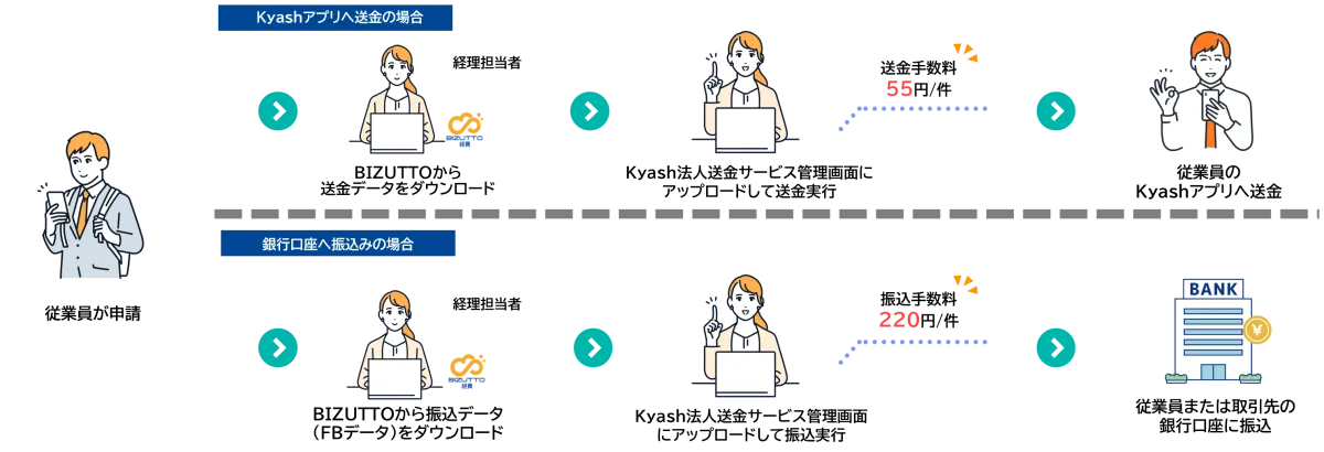 BIZUTTO経費を導入している企業は、従業員から申請された経費精算の際に、BIZUTTO経費から必要な送金データをダウンロードすることができます。その後、そのデータを「Kyash法人送金サービス」の管理画面にアップロードするだけで、簡単に従業員の銀行口座やKyashアプリに送金処理を行えます。これにより、経理担当者はわずらわしい手続きを大幅に簡略化でき、業務が効率化されるのです。