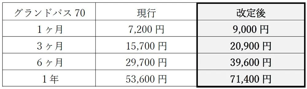 また、運賃の改定に併せて、グランドパス70の運用方法も見直しが行われます。重要な変更点は以下の通りです: