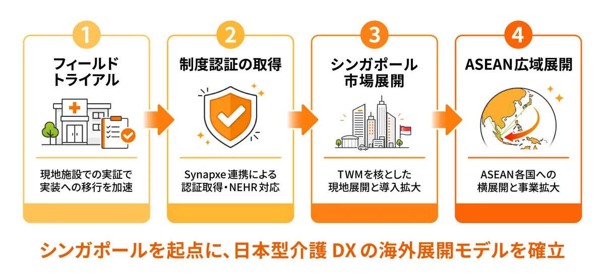 シンガポールを基点として、マレーシアやタイ、ベトナムなどのASEAN諸国にも技術やビジネスモデルを移転し、高齢化社会の課題解決に貢献していく方針です。