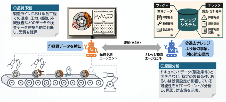 研究は、トヨタ車体が取得した作業記録や製造ラインでの温度、圧力、振動などのデータ、外観検査で撮影した画像や動画、さらには過去の履歴や製造条件を統合し、CTCがAIエージェントのプロトタイプを開発します。特に注目すべきは、AIエージェント同士が相互に情報を伝達し合う「A2A(Agent to Agent)」方式を採用することで、より精度の高い判断を実現する点です。