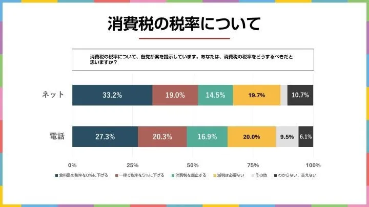 調査の質問内容は、「消費税の税率をどのようにすべきか」というもので、選択肢は6種類用意されました。「食料品の税率を0%に引き下げる」「一律税率を5%にする」「消費税廃止」「減税は必要ない」「その他」「わからない、答えない」といった選択肢です。