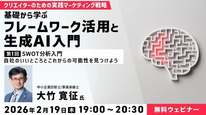 株式会社クリーク・アンド・リバー社(C&R社)は、2026年2月19日(木)に無料のオンラインセミナー「クリエイターのための実践マーケティング戦略 第1回:SWOT分析入門」を開催します。このセミナーは、マーケティングや戦略思考に自信がないクリエイターや個人事業主を対象としています。