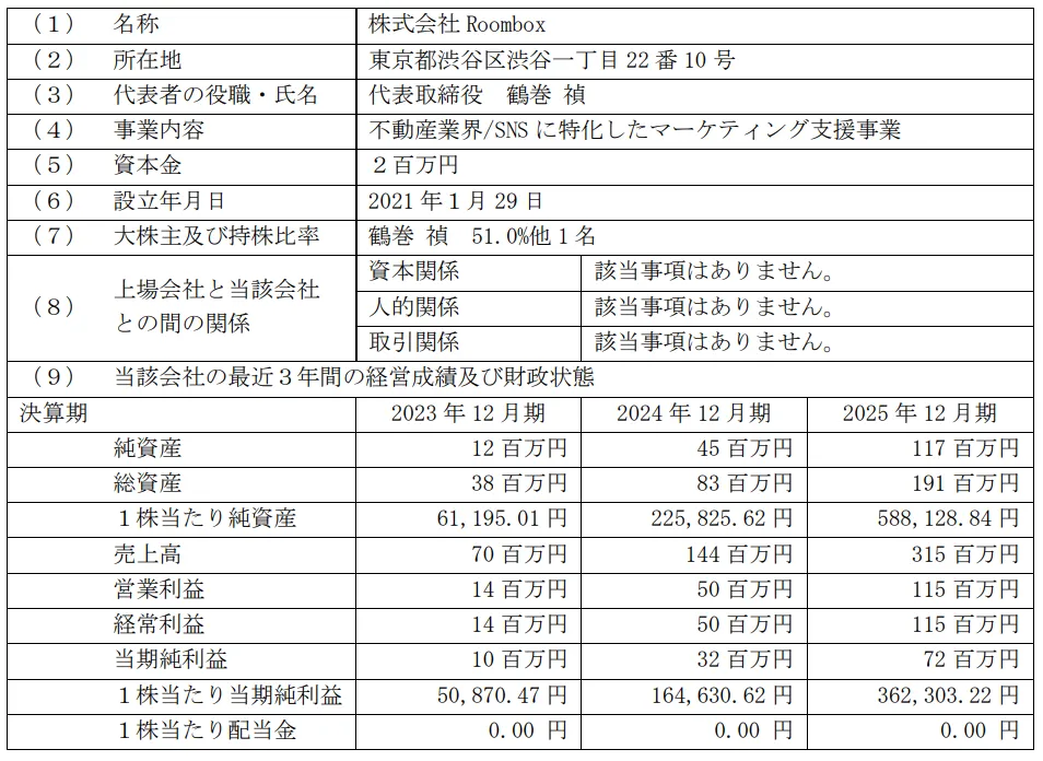 株式会社Roombox(以下、RBX社)の株式取得が決まり、当社はますますの成長を目指すこととなります。この決定は、2026年4月27日に開催された取締役会でのもので、RBX社は当社グループの戦略に深く関与していく重要な役割を果たすことになります。