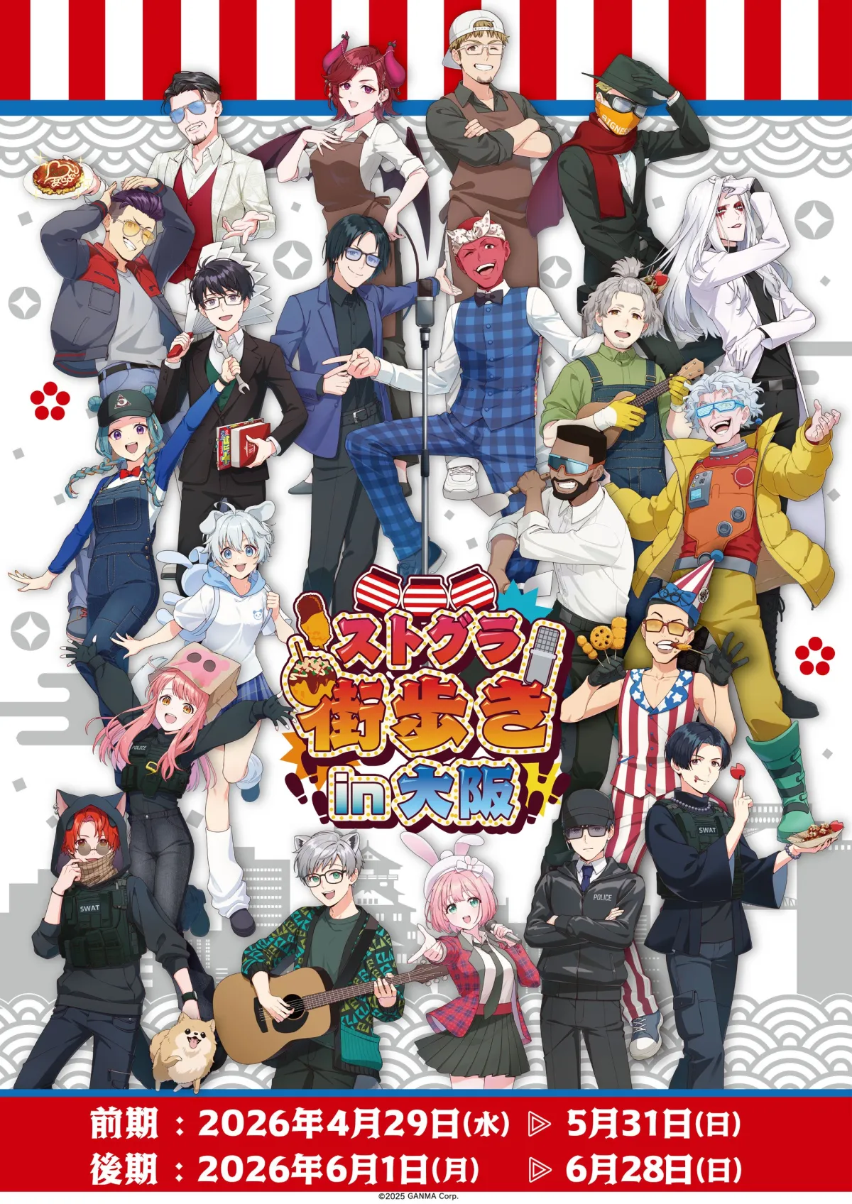 この「ストグラ街歩き in 大阪」は前期・後期に分かれており、前期は4月29日から5月31日、後期は6月1日から28日まで行われます。主要な開催場所にはなんばや新世界、天王寺などの大阪市内のエリアが選ばれています。